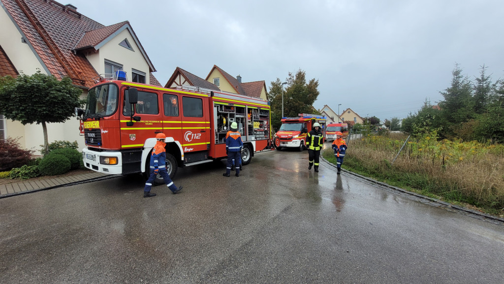 Während die Trupps im MLF mit einer Steckleiter nach der vermissten Person suchten, legten die Trupps vom LF16/12 den Schnellangriffsverteiler und löschten so den Brand.